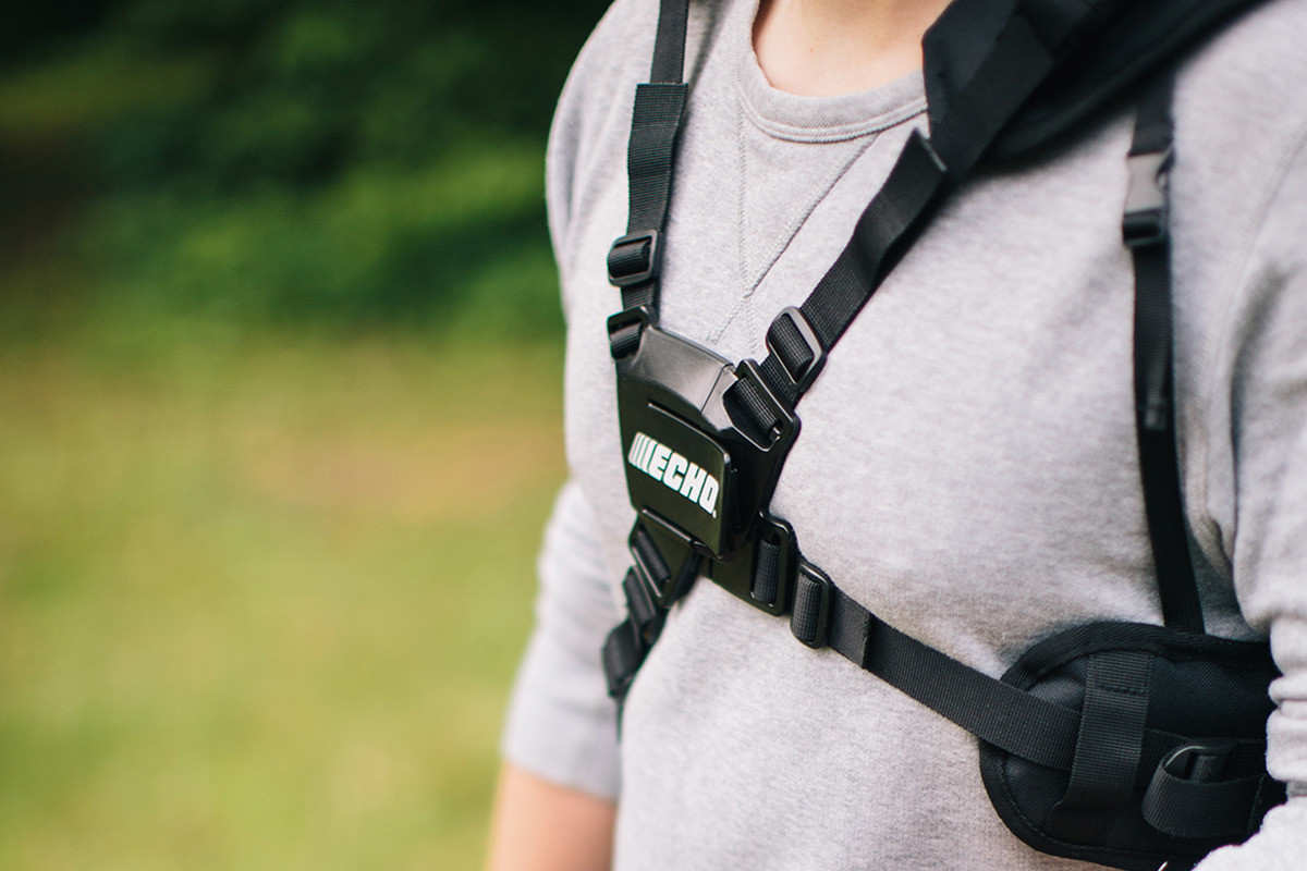 Zaino per decespugliatore con imbottiture sulle imbracature e sistema di aggancio/sgancio rapido.